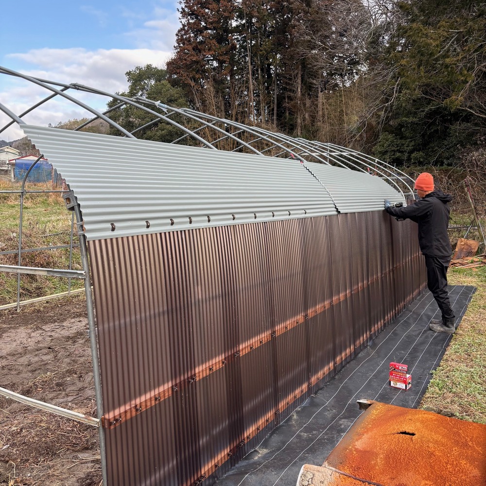 前の借主の人が残していった育苗用ハウスを片付けて、小型の農業機械や肥料、クワやスコップなどを保管できる倉庫にリニューアルさせています✨
